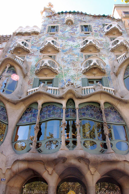 The easiest way to check out his work is with the touristic bus. Casa Battló is one stop away from Plaça Catalunya, walking distance. It’s the most colorful, and has the sea as main theme. Insane: